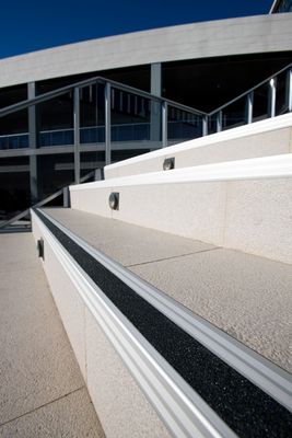Perfil para remate de peldaños Novopeldaño®Safety de Emac®. Fabricado en aluminio anodizado acabado plata mate nº13 con banda antideslizante de óxido de aluminio color negro de 30 mm. de ancho certificada como R13. Perfil de 2,5 m. de longitud para colocación con adhesivo después de obra, cara vista 65 mm. con estriado antideslizante y destinado a proteger aristas de instalaciones cerámicas en escaleras de cualquier espesor, colocado según se indica en la ficha técnica del fabricanteç