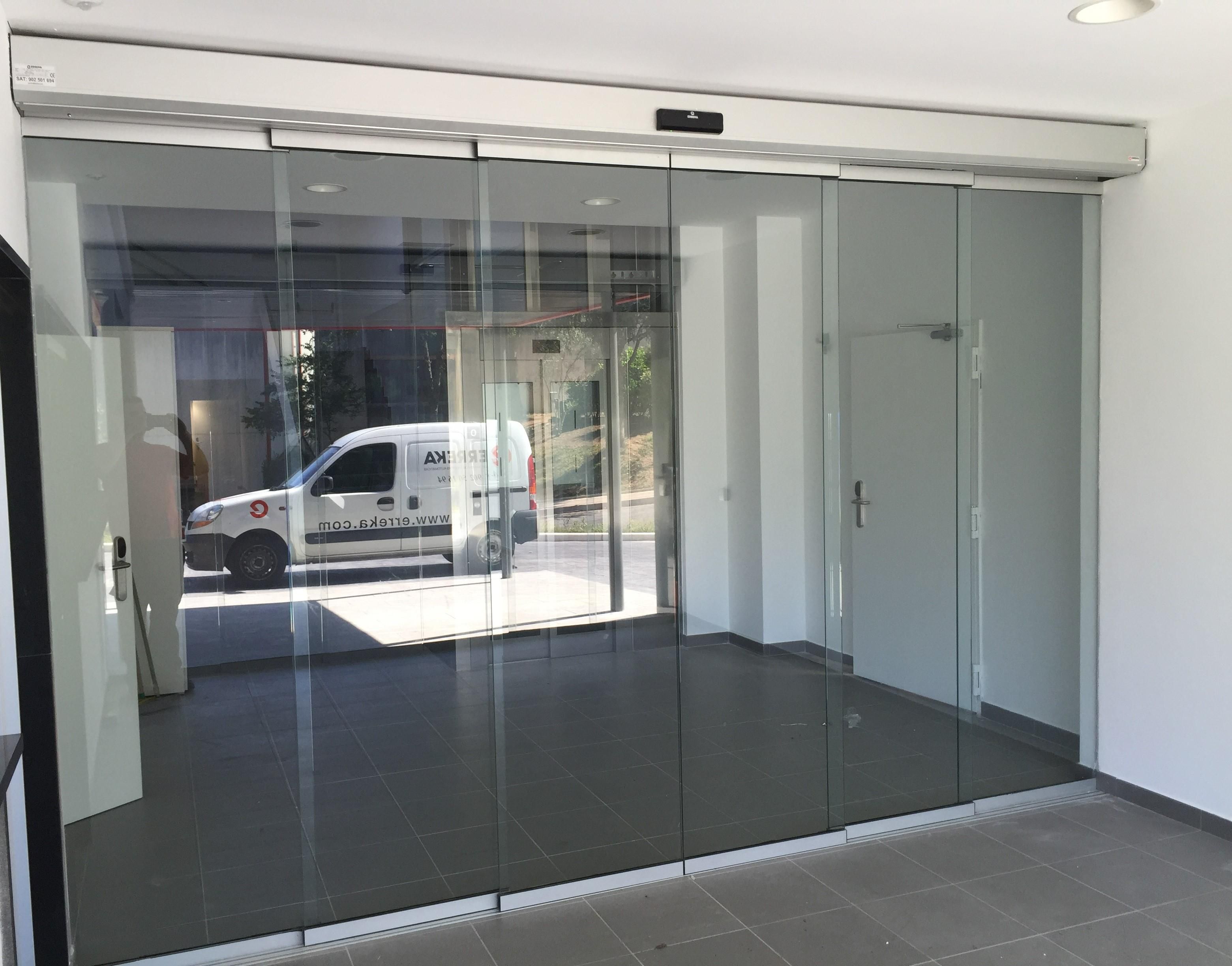 Puerta automática telescópica de ...(1), con perfilería Pinza diseñada para permitir la instalación de una puerta con vidrio desnudo, incluyendo junta de plástico y silicona para suaviza el encuentro entre hojas, paso libre de ...x... mm(2) con hojas móviles de ...x... mm y medidas de hojas fijas de ...x...mm, para hueco total de ...x...mm, que aportan a la fachada una entrada diáfana, ya que no existen marcos verticales y dejan que el vidrio sea el protagonista de la hoja.
