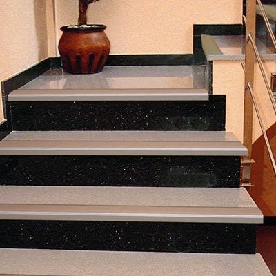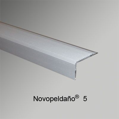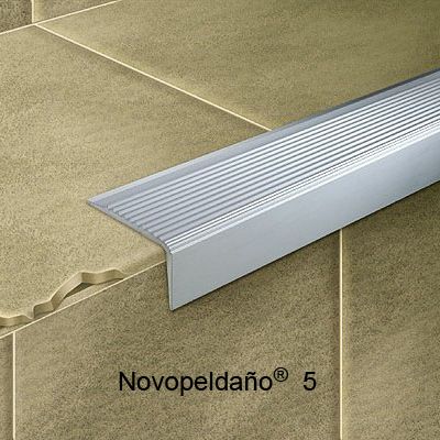 Perfil para el remate de peldaños después de obra Novopeldaño® 5 de Emac®. Fabricado en aluminio anodizado plata mate Nº 13. Perfiles de 2,5 m. de longitud con caravista estriada de a: 42 mm. y contrahuella de h: 22 mm., colocado con adhesivo después de obra para proteger las aristas de las escaleras revestidas con cerámica, según se indica en la ficha técnica del fabricante.
