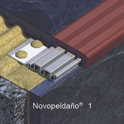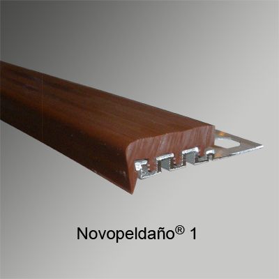 Perfil de PVC insertado en estructura de aluminio para remate de peldaños Novopeldaño® 1 de Emac®. Fabricado en PVC flexible con superficie estriada color antracita Nº 208 y aluminio natural, con posibilidad de fácil intercambio de la pieza de PVC. Perfiles de 2,5 m. de longitud protegidos con film protector, con caravista a: 35 mm., ala de fijación troquelada mediante perforaciones en forma de octógono y destinado a complementar baldosas u otro tipo de pavimentos con un espesor total de 25 mm, colocado según se indica en la ficha técnica del fabricante.