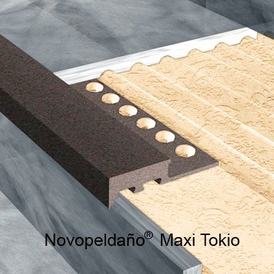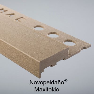 Perfil macizo para remate de peldaños Novopeldaño® MaxiTokyo de Emac®. Fabricado en Maxi (PVC Fibras Vegetales) color maxigris Nº 73. Perfiles de 1 m. de longitud con caravista de a: 40 mm., ala de fijación troquelada mediante perforaciones en forma de octógono y destinado a complementar baldosas u otro tipo de pavimentos con un espesor total de 10 mm, colocado según se indica en la ficha técnica del fabricante.