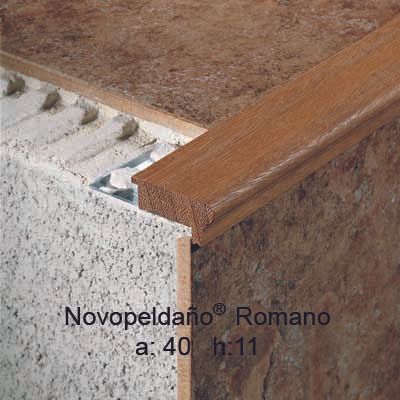 Perfil para remate de peldaños Novopeldaño® Romano de Emac®. Fabricado en madera natural de Caoba Nº 58. Perfiles de 1 m. de longitud protegidos con film protector, con ala de fijación troquelada mediante perforaciones en forma de octógono, de caravista a: 40 mm. y destinado a complementar baldosas u otro tipo de pavimentos con un espesor total de 11 mm, colocado según se indica en la ficha técnica del fabricante y con posibilidad de complementar con piezas para esquinas y evitar tener que hacer inglete.