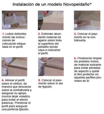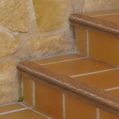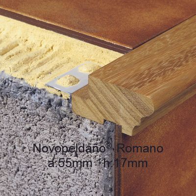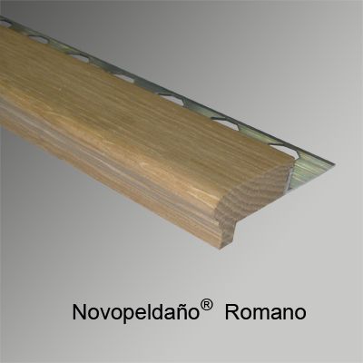 Perfil para remate de peldaños Novopeldaño® Romano de Emac®. Fabricado en madera natural de Caoba Nº 58. Perfiles de 1 m. de longitud protegidos con film protector, con ala de fijación troquelada mediante perforaciones en forma de octógono, de caravista a: 55 mm. y destinado a complementar baldosas u otro tipo de pavimentos con un espesor total de 17 mm, colocado según se indica en la ficha técnica del fabricante y con posibilidad de complementar con piezas para esquinas y evitar tener que hacer inglete.