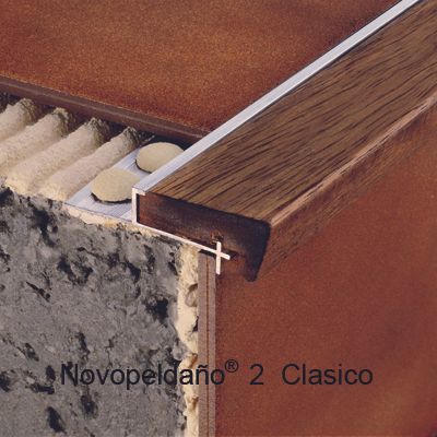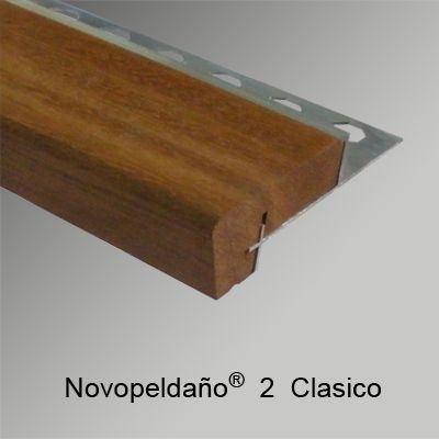 Perfil para remate de peldaños Novopeldaño®2 Clásico de Emac®. Fabricado en madera natural de Iroko Nº 17. Perfiles de 2,5 m. de longitud protegidos con film protector, con ala de fijación troquelada mediante perforaciones en forma de octógono, de caravista a: 70 mm. y destinado a complementar baldosas u otro tipo de pavimentos con un espesor total de 17,5 mm, colocado según se indica en la ficha técnica del fabricante y con posibilidad de complementar con piezas para esquinas y evitar tener que hacer inglete.