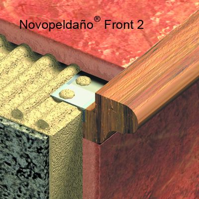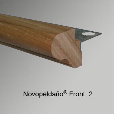 Perfil para remate de peldaños Novopeldaño®Front 2 de Emac®. Fabricado en madera natural de Tali Nº 57. Perfiles de 1,50 m. de longitud protegidos con film protector, con ala de fijación troquelada mediante perforaciones en forma de octógono, de caravista a: 39 mm. y destinado a complementar baldosas u otro tipo de pavimentos con un espesor total de 12 mm, colocado según se indica en la ficha técnica del fabricante y con posibilidad de complementar con piezas para esquinas y evitar tener que hacer inglete.