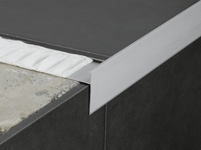 Remate perimetral de amplia cara vista Novoperi de Emac® fabricado en aluminio anodizado espejo nº 110. Perfil de 2,50 mm. de longitud, con ala de fijación troquelada mediante perforaciones en forma de octógono para su instalación durante el alicatado, cara vista a:50 mm. y destinado a embellecer el remate de peldaños, balcones, o encimeras revestidas con baldosas u otros de espesor total 10 mm. , colocado según se indica en la ficha técnica del fabricante.