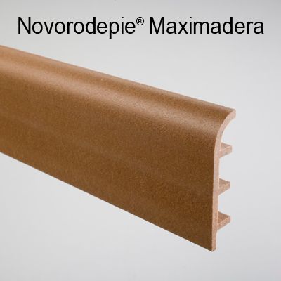 Rodapié o zócalo decorativo para cubrir la unión entre suelo y pared de diferentes o similares revestimientos Novorodapié® Maxi de Emac®. Fabricado en PVC Fibras Vegetales acabado maximadera Nº 72. Perfil de 2,5 m. de longitud, con valor de caravista de 60 mm., colocado según se indica en la ficha técnica del fabricante.