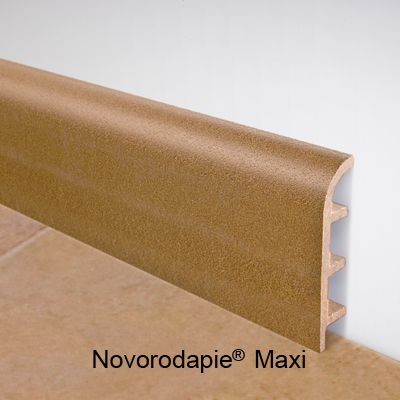 Rodapié o zócalo decorativo para cubrir la unión entre suelo y pared de diferentes o similares revestimientos Novorodapié® Maxi de Emac®. Fabricado en PVC Fibras Vegetales acabado maxipizarra Nº 81. Perfil de 2,5 m. de longitud, con valor de caravista de 60 mm., colocado según se indica en la ficha técnica del fabricante.