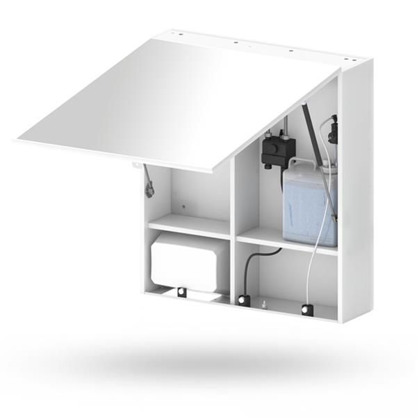 Solución sanitaria completa de gabinete y espejo con cerradura. Incluye secador de manos de alta velocidad, válvula mezcladora, grifo y dispensador de jabón libres de contacto y pictogramas Iluminados con LED para indicación y decoración. Provisto con mandos a distancia para ajustar la dosis de jabón, seleccionar el color o la secuencia de luz y personalizar la configuración del grifo. Evita los suelos mojados y resbaladizos y ahorra esperas para el uso del secador de manos.