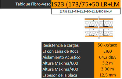 Tabique fermacell modelo 1S23 (12,5+75+12,5+e+50+12,5 LR+LM), espesor total 173mm, formado por un tabique de panelado simple con placas de fibra yeso fermacell de 12,5 mm de espesor, según ETE 03/0050, identificación GF-I-W2-C1 (UNE EN 15283-2), densidad 1150 +/- 50 kg/m3, atornilladas a cada lado de una subestructura compuesta por canales de UW de 50 x 40 x 0,6 mm, montantes de perfil CW de 48,8 x (49/47) x 0,6 (alas desiguales), más un trasdosado independiente de placa simple de fibra yeso fermacell de 12,5mm de espesor, separado 10mm del tabique, con subestructura compuesta de canales de UW de 75 x 40 x 0,6 mm, montantes de perfil CW de 73,8 x (49/47) x 0,6mm (alas desiguales). Perfilería de chapa de acero galvanizado en caliente según UNE EN 14195:2005. Todas las placas atornilladas a los montantes cada 25 cm, con tornillos fermacell de 3,9 x 30 mm fosfatados, de cabeza tronco-cónica con rosca. Montantes cada 600 mm. Las placas vistas son de tipo borde rebajado mientras que la placa oculta es de tipo canto recto.