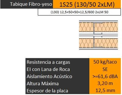 Tabique Fibro-yeso - 1S25 (12,5+50+e+50+12,5 2xLM)