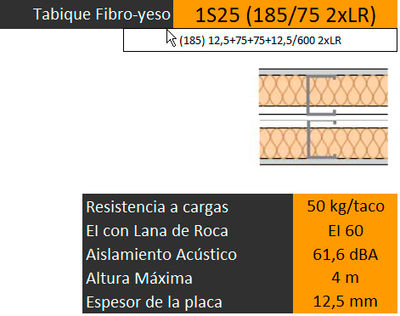 Tabique fermacell modelo 1S25 (12,5+75+e+75+12,5 2xLM), espesor total 185mm, formado por dos placas de fibra yeso fermacell de 12,5 mm de espesor con canto rebajado, según ETE 03/0050, identificación GF-I-W2-C1 (UNE EN 15283-2), densidad 1150 +/- 50 kg/m3, atornilladas a a cada lado de una estructura doble compuesta por canales de UW de 75 x 40 x 0,6 mm, montantes de perfil CW de 73,8 x (49/47) x 0,6 mm (alas desiguales), ambos construidos en chapa de acero galvanizado en caliente según UNE EN 14195:2005, atornilladas a los montantes cada 25 cm, con tornillos fermacell de 3,9 x 30 mm fosfatados, de cabeza tronco-cónica con rosca. Montantes cada 600 mm.