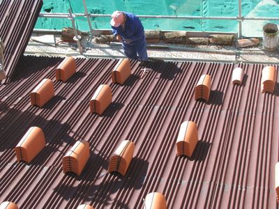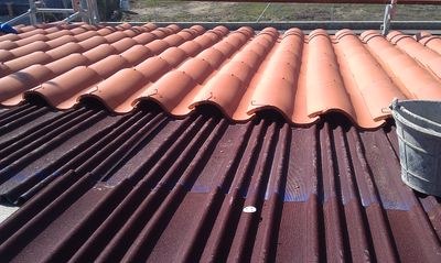 ® Bajo Teja DRS* BT150 Plus (Doble resina & Solape Seguridad) fijada mecánicamente al soporte de la cubierta con el Tornillo Compacto Onduline, colocación de listones de PVC paralelos al alero y sobre estos teja de hormigón. Sellado de encuentros y limas con cinta de butilo impermeable
