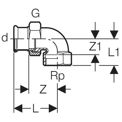Unión en codo de transición 90° Geberit serie Mapress Cobre con rosca hembra: CC499K, d=18mm, Rp=1/2″