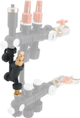 Bypass para conectar directamente sobre el colector modular Uponor, gama Vario Plus provisto de válvula de sobrepresión diferencial, permitiendo recircular el caudal de la bomba en caso de cierre de todos los circuitos del colector, compatible con los grupos de impulsión Uponor que no llevan bypass incorporado. Medida la unidad instalada. Cód.1046884