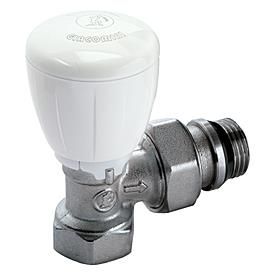 Válvula termostatizable a escuadra, de doble reglaje y con conexión para tubo de hierro.